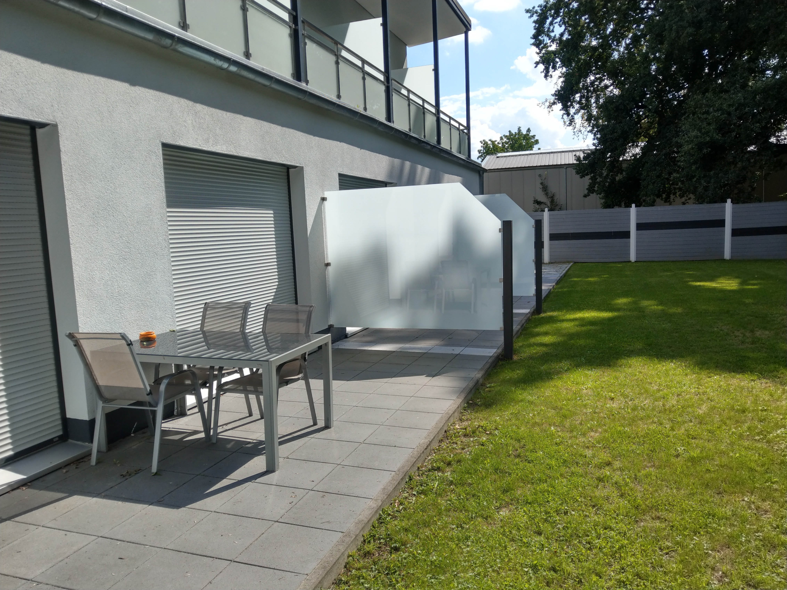 Die Pflasterarbeiten im Außenbereich sind erledigt, Rasen ist gesät, und die Außenmöblierung ist auch aufgestellt.