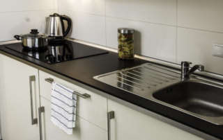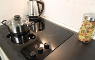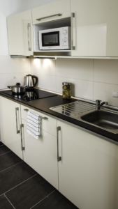 Die komplett eingerichtete Küchenzeile für unsere Selbstversorger ist mit einer Mikrowelle, einem geräumigen Einbaukühlschrank mit Eisfach, einem Herd mit Ceranfeld, einer Dunstabzugshaube sowie einer Edelstahlspüle ausgestattet. Geschirr, Gläser, Besteck sowie ein Topf- und Pfannenset stehen für Sie bereit.