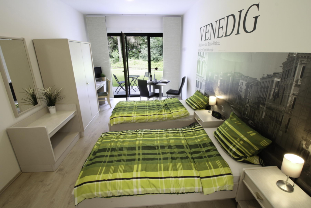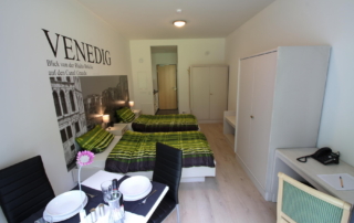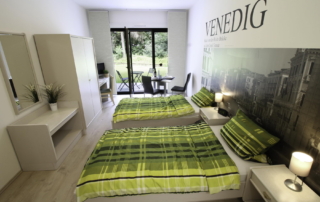 Es erwartet Sie ein geschmackvoll eingerichtetes, helles, 30m² großes Komfortzimmer mit gehobener Einrichtung und einem großzügigen Raumangebot. Der gemütliche Wohn- und Schlafraum ist mit einem Esstisch für 2 Personen, zwei Einzelbetten mit Nachtkästchen und einem Kleiderschrank vollständig eingerichtet.